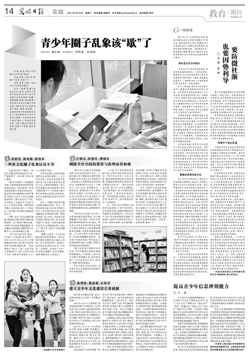 2021年7月,中央网信办启动“清朗·暑期未成年人网络环境整治”专项行动,特别聚焦论坛社区、群圈等环节中危害未成年人问题以及互撕谩骂、拉踩引战等“饭圈”乱象。而近期吴亦凡、张哲瀚的“塌房”事件令以粉丝文化为代表的青年亚文化再次走到舆论的风口浪尖。