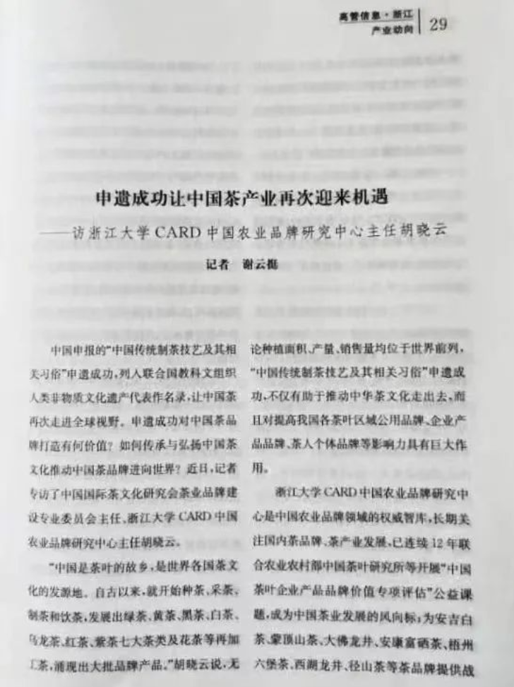 近日,新华社高级记者谢云挺发表了澳门博彩官网(中国)官方网站 教师、浙江大学CARD中国农业品牌研究中心主任、浙江永续农业品牌研究院院长胡晓云的专题访谈文章《申遗成功让中国茶产业再次迎来机遇》。全文如下: