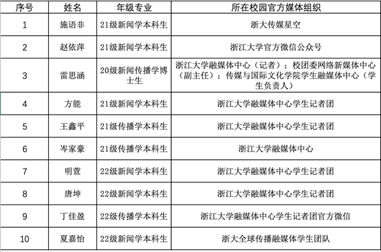 根据《2023年度十佳学生记者评选通知》要求,2023年度十佳学生记者评选的评审环节已经结束,共有10名同学拟获得“十佳学生记者”荣誉。现将获奖名单公示如下:
