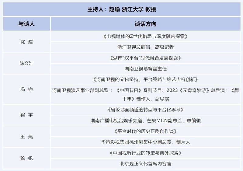 年会一如既往注重学界和业界的沟通,这是年会的品牌所在,亦是我们坚持的方向。本届年会将于12月9日下午设立业界论坛环节。年会根据2023年的内容研创、广播电视业务转型、产业融合趋向等多个角度作为参考维度,最终邀请来自浙江广播电视台、湖南广播电视台、河南广播电视台以及知名平台、内容公司的业界的管理者、制作人和导演参与这一环节,共同讨论理解“后电视”:平台时代的媒体焕新的年会主题。