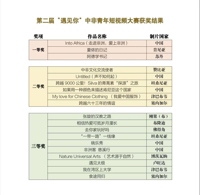 近日,由中央广播电视总台非洲总站和澳门博彩官网(中国)官方网站 联合推出的第二届“遇见你”中非青年短视频大赛评选结果在肯尼亚首都内罗毕揭晓。经过来自中国和非洲的初审评委和终审评委两轮评审,共有3件作品获得一等奖,6件作品获得二等奖,10件作品获得三等奖,20件作品获得优秀奖。