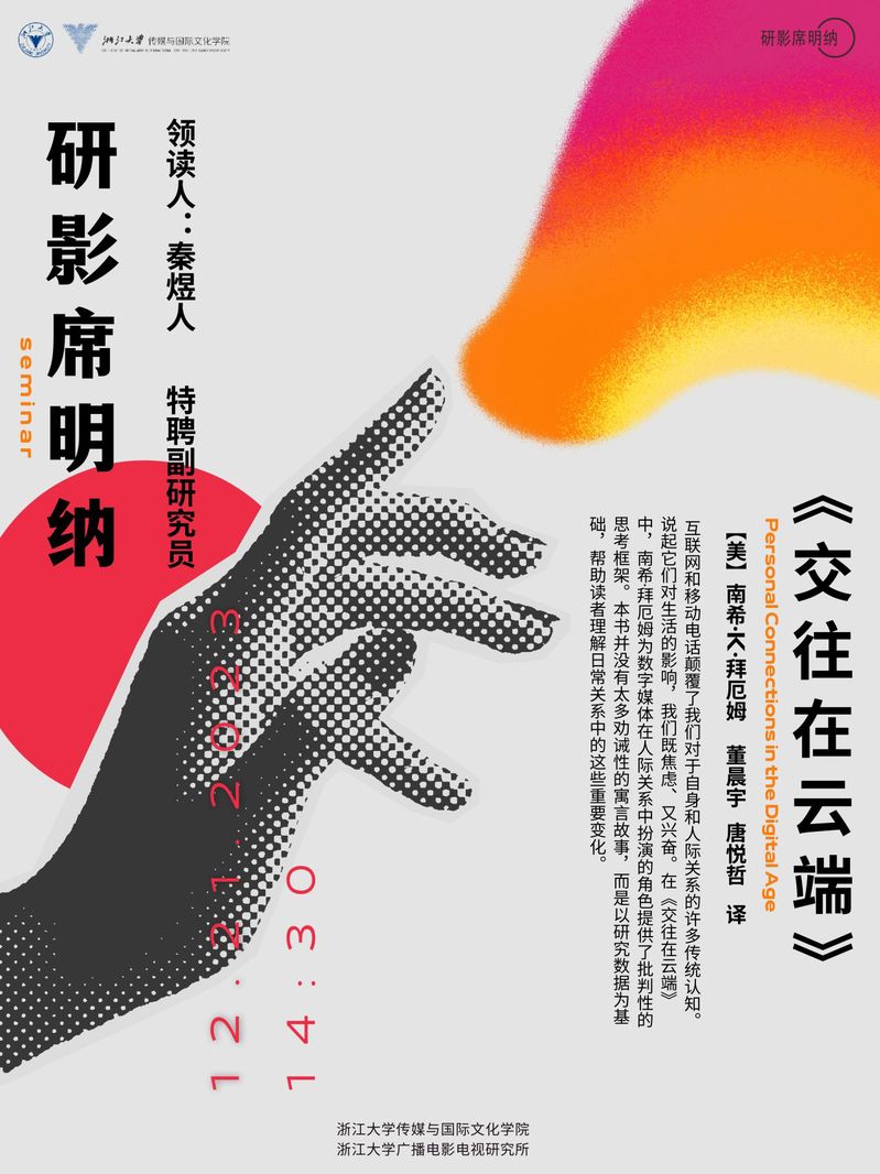 12月21日下午,第六期研影席明纳在浙江大学紫金港校区西区澳门博彩官网(中国)官方网站 614教室成功举行。澳门博彩官网(中国)官方网站 特聘副研究员秦煜人老师作为领读人,为大家带来《交往在云端:数字时代的人际关系》的深度解读,带领同学们一同踏上这场关于云端交往的探索之旅。