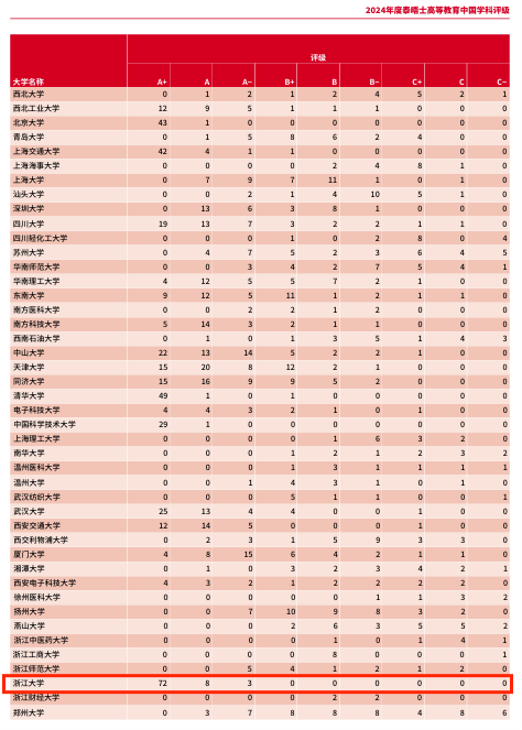 2024年泰晤士高等教育中国学科评级共有86所中国大陆高校获得评级,获得A+评级最多的3所高校分别是浙江大学(72个A+)、清华大学(49个A+)与北京大学(43个A+)。