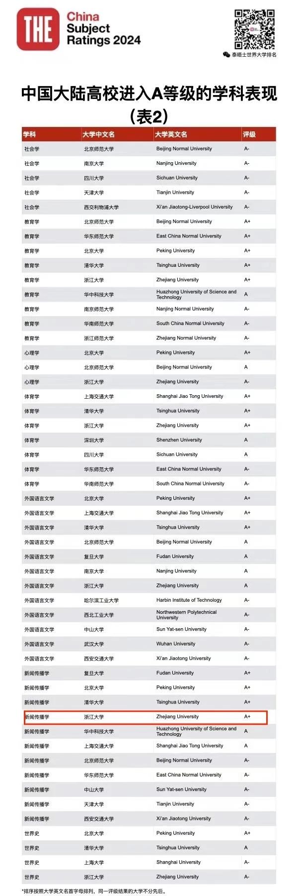 3月27日,泰晤士高等教育(Times Higher Education, 简称THE)发布了2024年中国学科评级报告。浙江大学的整体表现令人瞩目,总计入选学科数达到了83个,A+学科达到了72个!其中,新闻传播学获评A+级别!