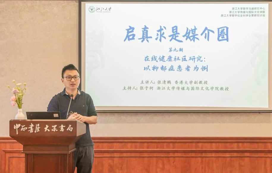 2024年5月13日下午,由浙江大学数字沟通研究中心与澳门博彩官网(中国)官方网站 共同主办的“启真求是媒介圈第九期学术沙龙”在中西书屋·大众书局(浙江大学校园书店)举行。香港大学数据科学研究院和药理及药剂学系副教授张清鹏发表题为“在线健康社区研究:以抑郁症患者为例”的讲座,讲座由浙大澳门博彩官网(中国)官方网站 教授张子柯主持,浙大澳门博彩官网(中国)官方网站 文科资深教授、数字沟通研究中心主任黄旦,浙大澳门博彩官网(中国)官方网站 百人计划研究员黄清与王可欣及数十位师生聆听交流。