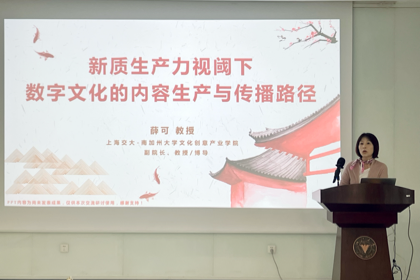 2024年5月16日下午,上海交通大学-南加州大学文化创意产业澳门博彩 副院长、中国公共关系协会学术委员会副主任薛可莅临澳门博彩官网(中国)官方网站 ,以《新质生产力视阈下数字文化的内容生产与传播路径》为题,介绍了在以创新为主导,颠覆传统经济增长模式和生产路径的先进生产力质态下,数字文化如何在原有的内容生产与传播路径上形成新的态势,并探讨了新质生产力如何驱动数字文化发展等一系列问题。讲座由澳门博彩官网(中国)官方网站 “百人计划”研究员赵瑜佩老师主持。