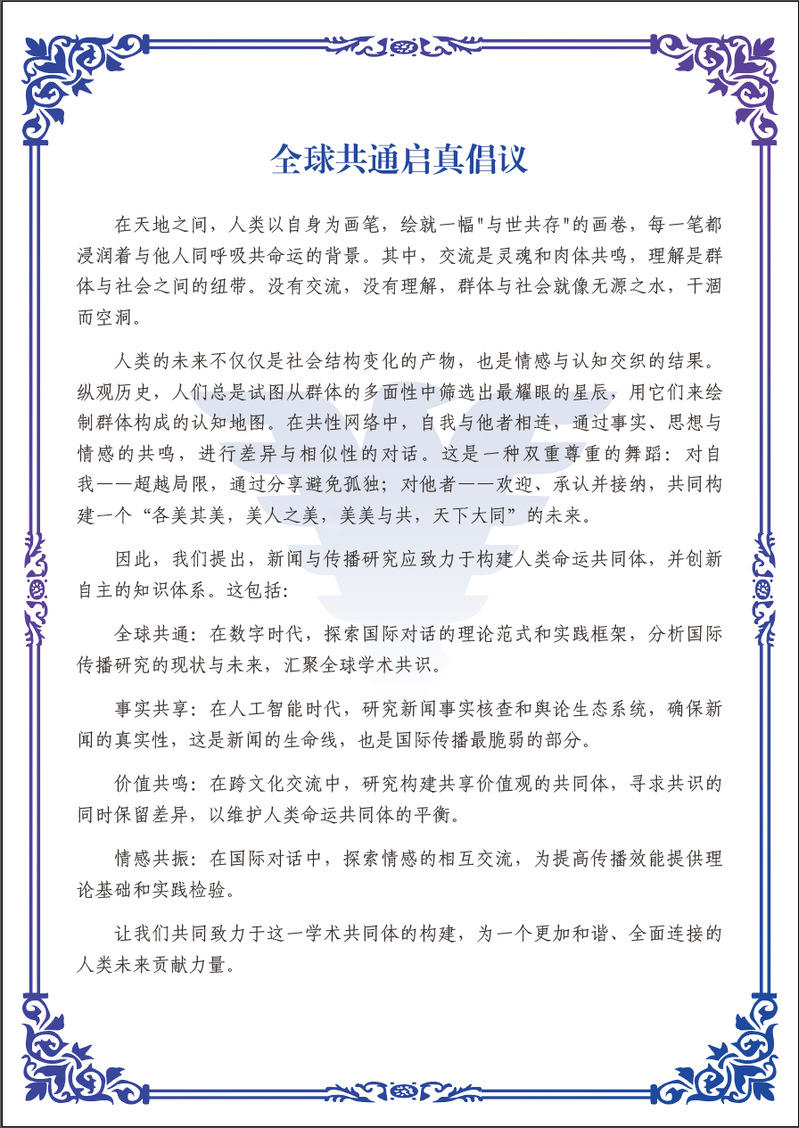 牵头、与会专家共同讨论,论坛发起《全球共通启真倡议》,提出新闻与传播研究应致力于构建人类命运共同体,以全球共通、事实共享、价值共鸣、情感共振的方式创新中国自主的知识体系,讲好中国故事。