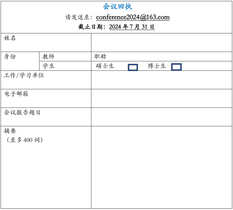 会议注册费为800元人民币。学生可享受半价优惠。注册费包括会议文件以及2024年10月26日(星期六)和10月27日(星期日)的茶歇与午餐。与会者的交通费和住宿费用自理。(点击文末附件下载会议回执)