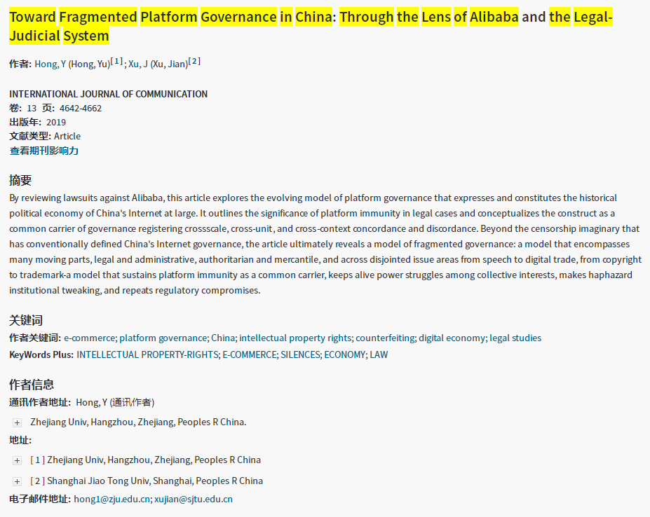 2019-12-15 《INTERNATIONAL JOURNAL OF COMMUNICATION》 洪宇,Xu jianBy reviewing lawsuits against Alibaba, this article explores the evolving model of platform governance that expresses and constitutes the historical political economy of China's Internet at large. It outlines the significance of platform immunity in legal cases and conceptualizes the construct as a common carrier of governance registering crossscale, cross-unit, and cross-context concordance and discordance. Beyond the censorship imaginary that has conventionally defined China's Internet govern 更多 -