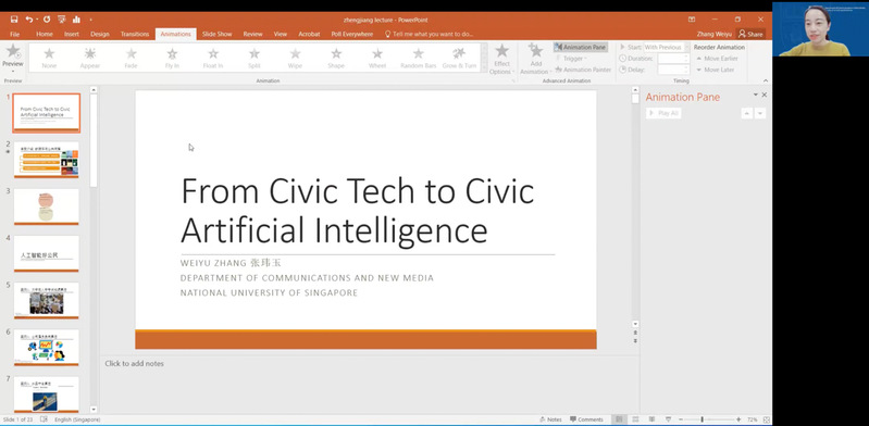 On the afternoon, Prof. Zhang Weiyu From the National University of Singapore gave a lecture entitled From Civic Tech to Civic Artificial Intelligence. She explained what Civic Tech was from the perspectives of Gov Tech, CSO Tech and Civic Tech Entity, and then she organized a discussion to help students to have a deeper understanding of the unify between artificial intelligence development and application and civil values.